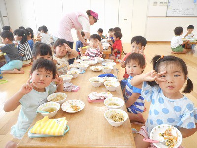 自分で手づかみで食べたり、先生にアーンとお口に運んでもらったりしながら食べているすみれ組さん!