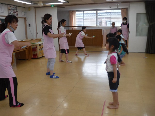 保育士の投げるしゅりけんを、跳んだりしゃがんだりして