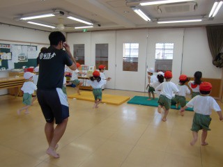 鉄棒に飛びついて、「つばめ」のポーズです!